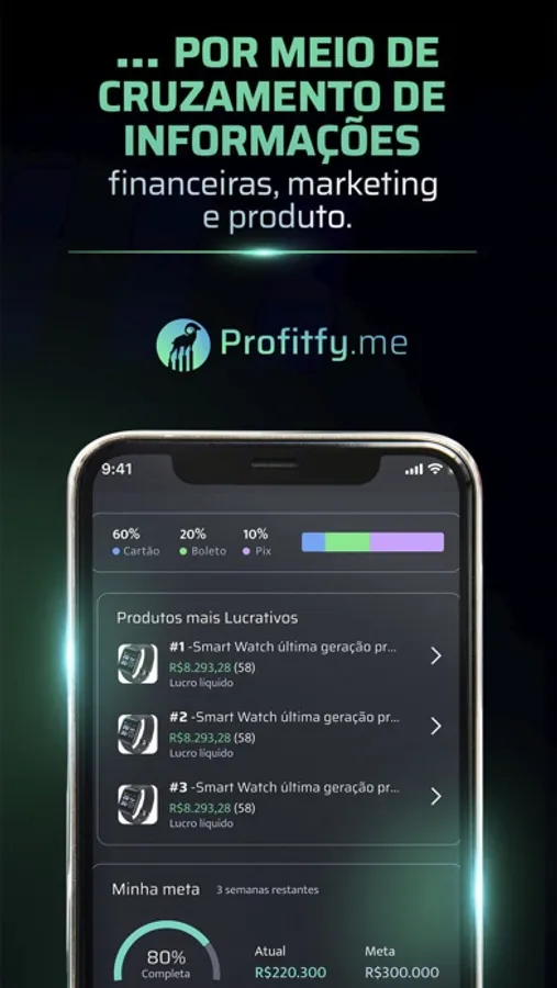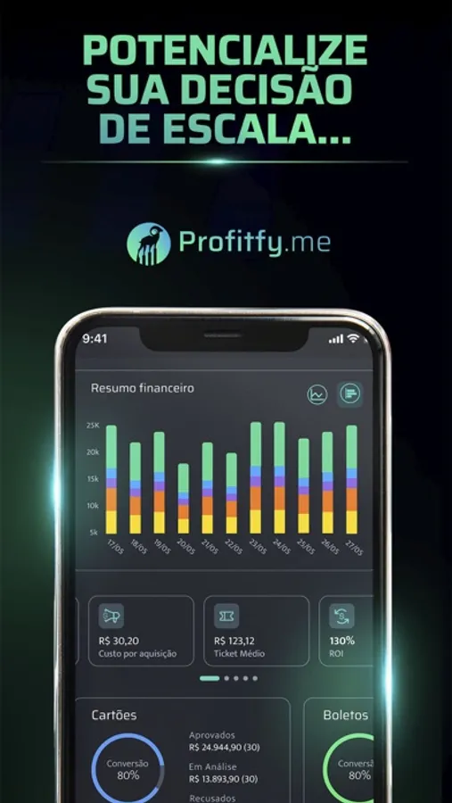 A Profitfy cruza e centraliza informações financeiras, de marketing e produto, te gerando painéis super intuitivos em tempo real, para que você saiba exatamente onde você está errando para consertar, e acertando para escalar.