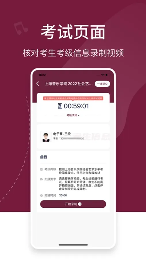 考级帮APP主要用于辅助机构老师批量录制考生考级视频。后台导入批量录制名单,老师通过手机号及验证码登录后,即可在考级帮APP中协助考生完成身份认证、视频录制和上传。
