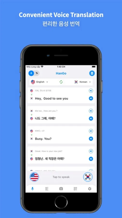 The voice translating feature translates to korean and vice versa, translate text to voice with typing from keyboard.