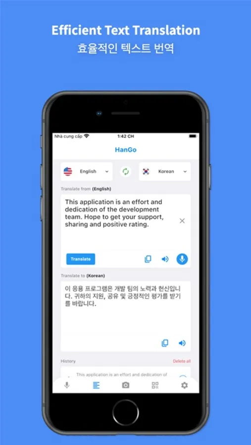 Hi ! HanGo is the leading Korean Translator with a lot of outstanding features such as accurate voice translator, translate any text in 45 languages to korean or korean to any language such as: english, japanese, chinese, etc and extremely useful photo translating feature or learning korean more easily.