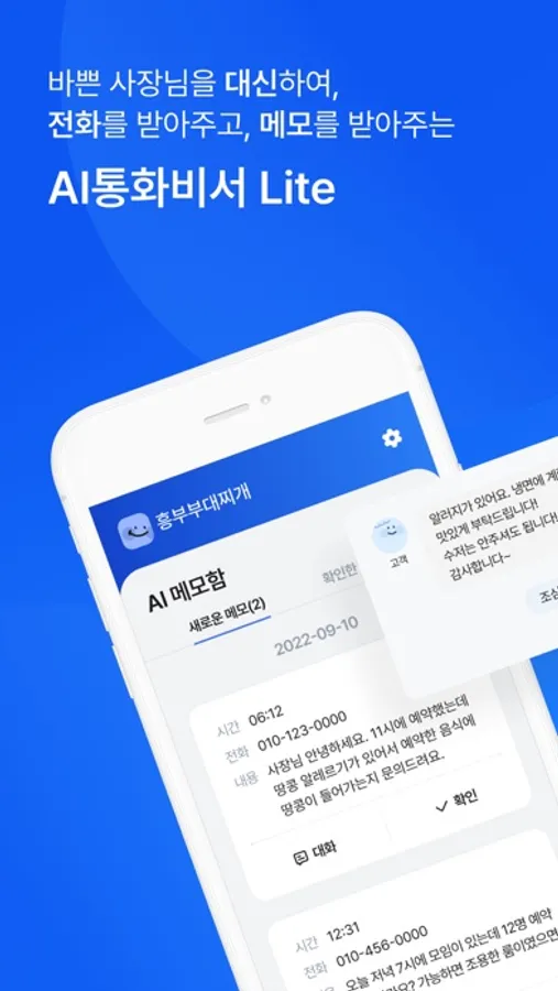 AI 통화비서 Lite는 소상공인에게 제공되는 서비스로 전화를 받기 힘든 상황에 AI가 전화를 대신 받아 고객의 용건을 듣고 글자로 남겨주어 놓치는 전화가 없도록 도와드려요.