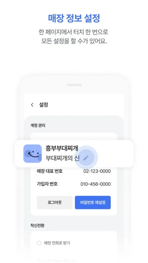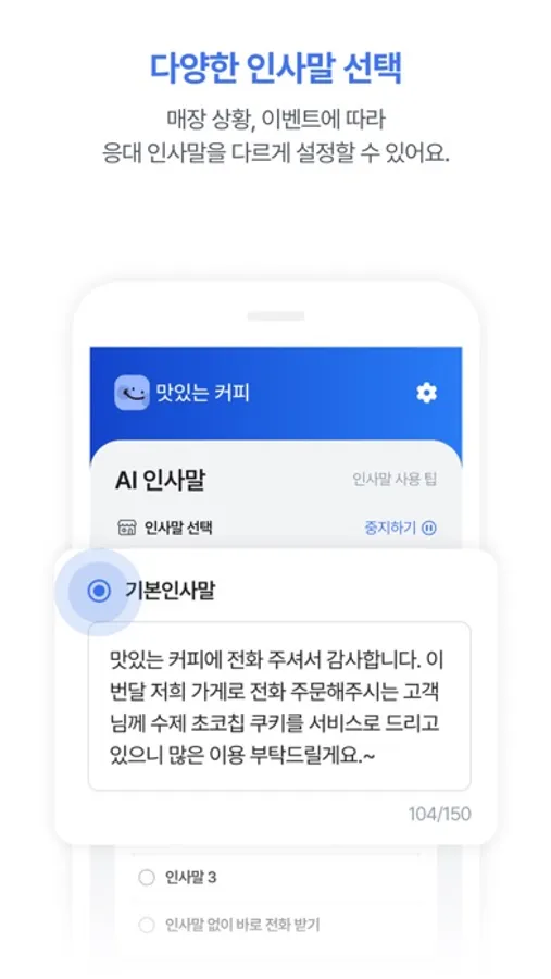 더불어, 인사말 설정을 통해 통화연결과 동시에 실시간 매장 상황이나 프로모션 안내를 고객에게 자유롭게 전달할 수 있어요.