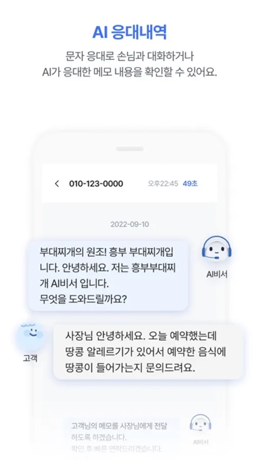 - 부재중이나 업무로 바빠 전화를 받기 힘들 때 매장 전화를 임시로 꺼놓고 AI가 전화를 대신 받아 고객의 용건을 글자로 받아 적어 앱으로 전달