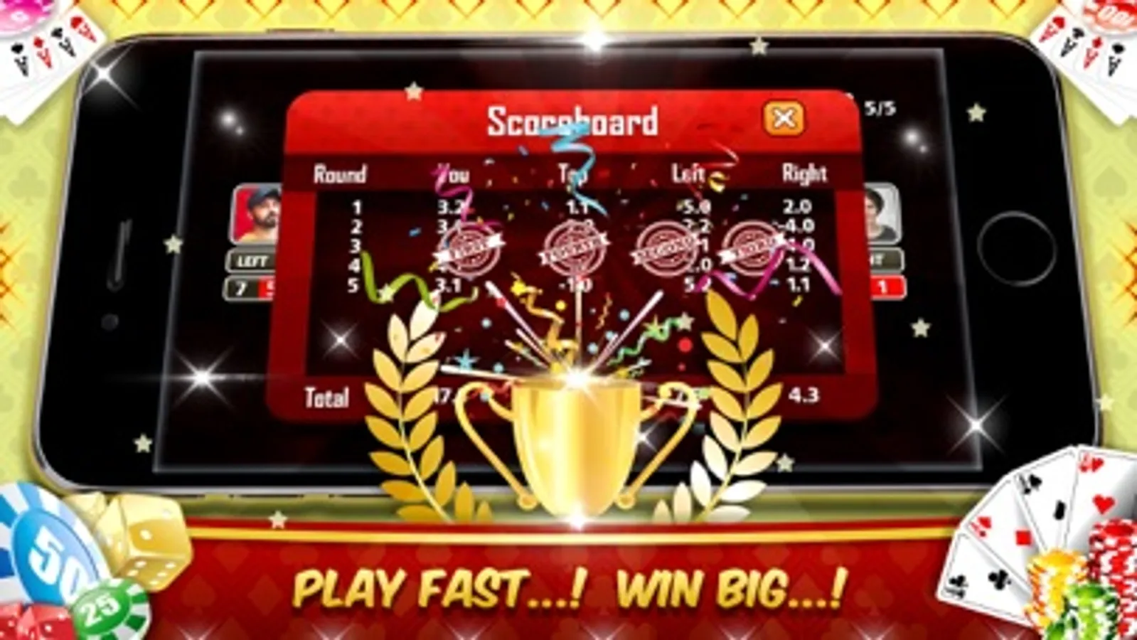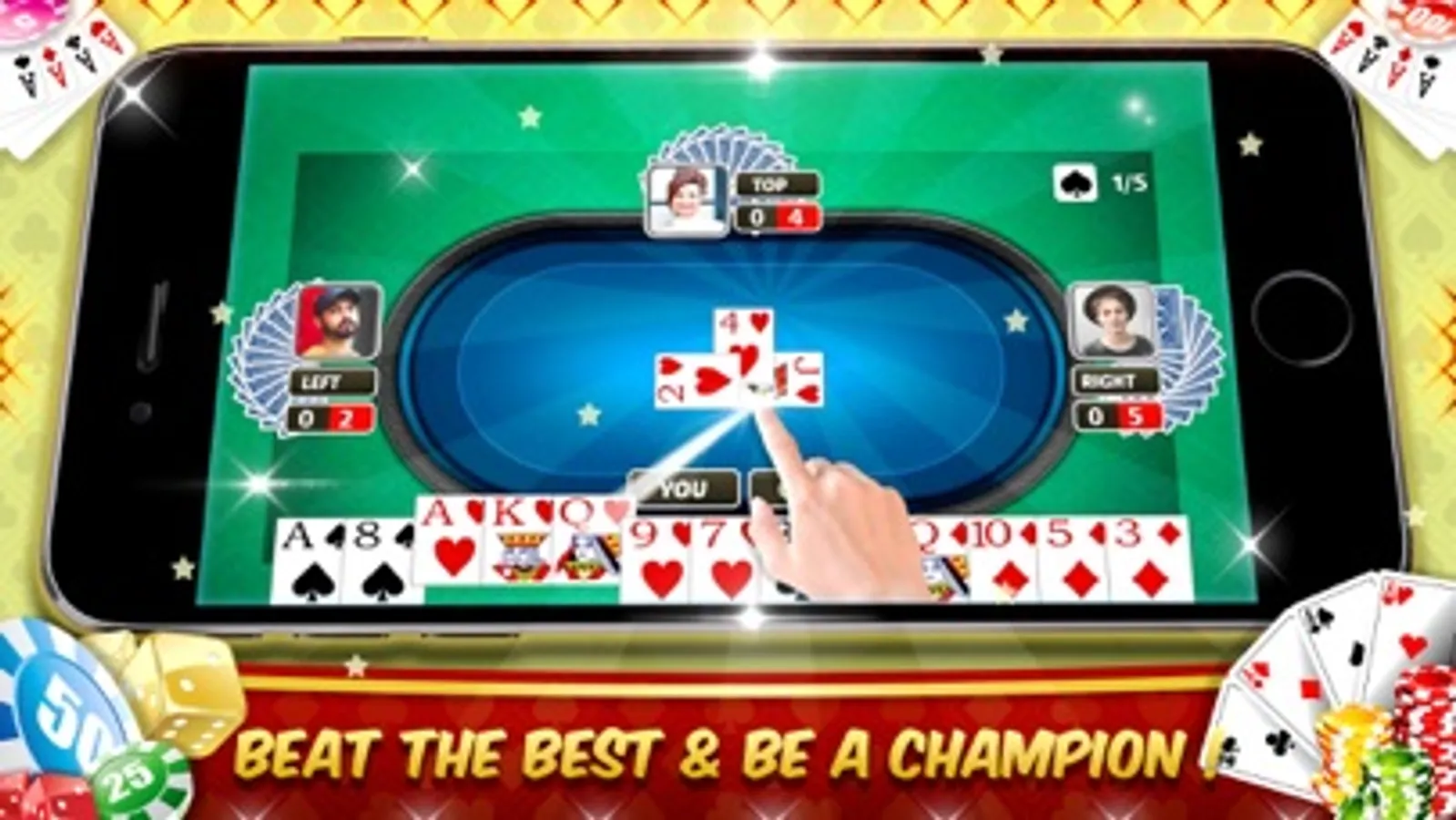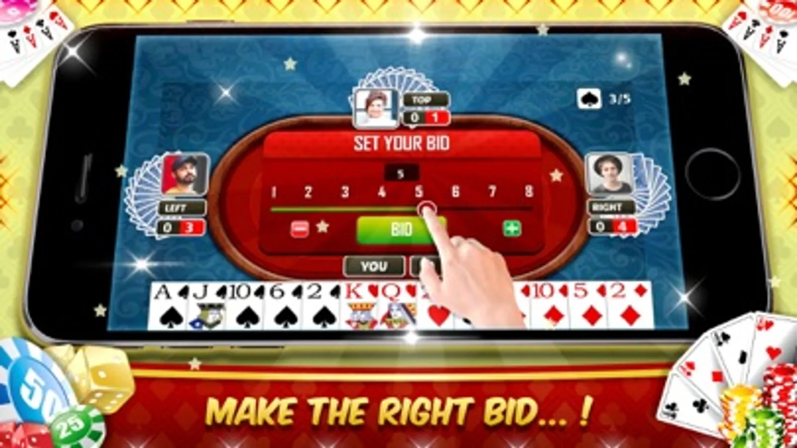 Dealer gives 13 cards to each player. At the beginning of the game players will bid how many card hands they will win. The game is about winning maximum number of hands but also breaking other people’s bids. This is called call breaking. Points are decided based on how many less or more hands player makes than player’s bid.
