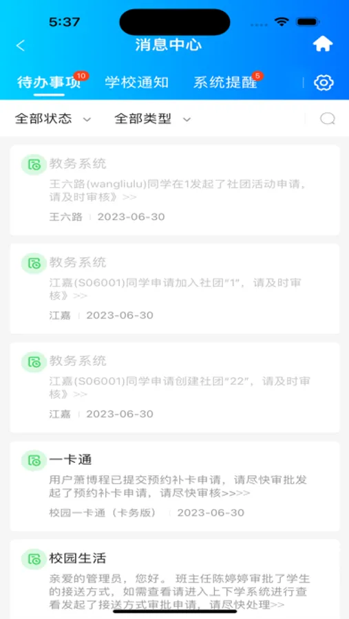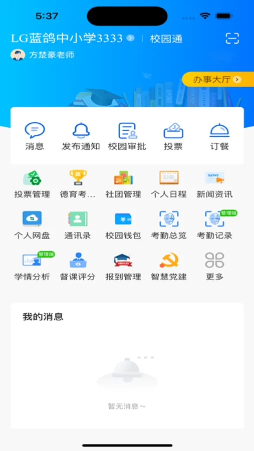 紫金智慧校园通移动客户端软件V5.0是综合性的、集成多个子系统的、适用于学校学习教育、方便老师学生和家长了解学生信息和学校信息的管理平台。其中主要包括请假系统、虚拟班牌与报修系统,校园OA系统、校园门户、物联网设备管控、归寝信息等多个子系统,作为管理平台,用户可以快速便捷在校园通小程序中使用子系统的功能,结合公众号推送,能够方便教师、学生和家长进行交流,快速进行消息通知公告,从而实现在线互联,高效工作。