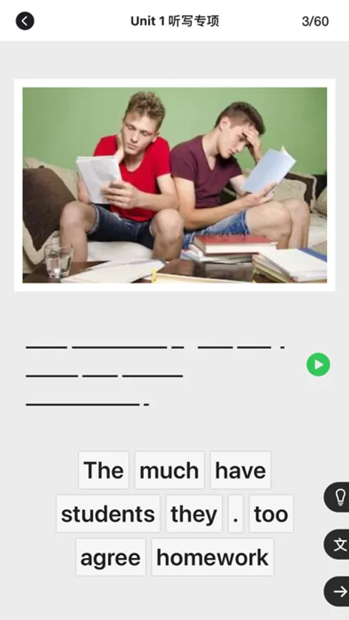 单词学习、快速学习、课文学习、听力、听写、阅读、磨耳朵、单词卡片、模拟测试、中英测试等
