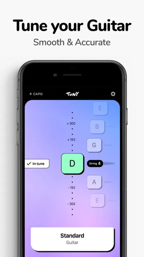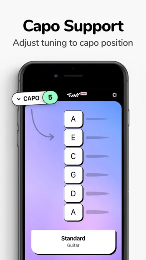 Adjusts the tuning to the capo position. When you use a capo, the notes on your guitar change. This can get fiddly when tuning, especially if you're using alternate tunings that you're not as familiar with. With the app, you don't have to think about transposed strings. Tip: When tuning with the capo, it is particularly important that you first tune the string a little lower and then tune "from below" towards the tone. Because the capo clamps the strings, you have to pull the string gently after you have tuned it a little lower and then tune it.