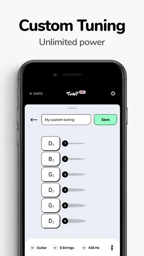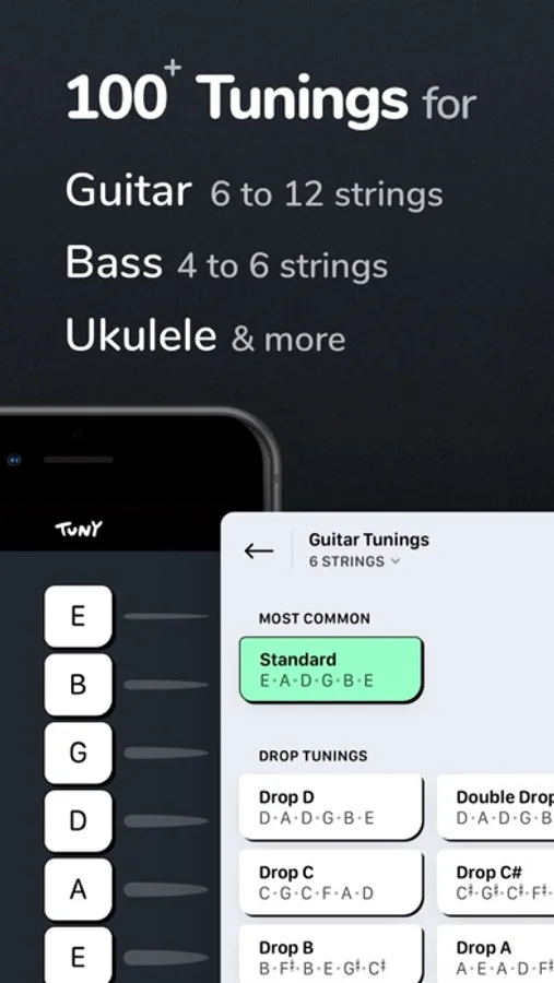 The app integrates all common tunings as well as many alternative tunings. Use the "Search" function to find what you're looking for quickly.