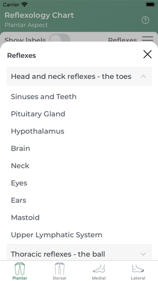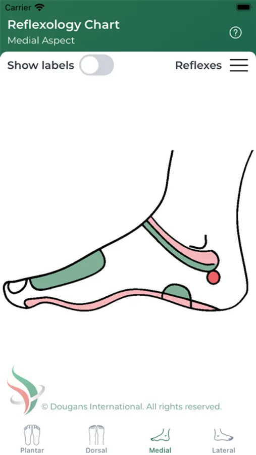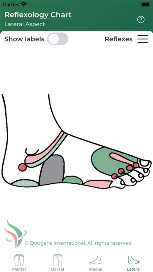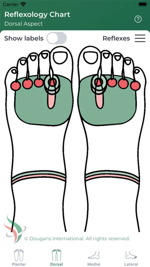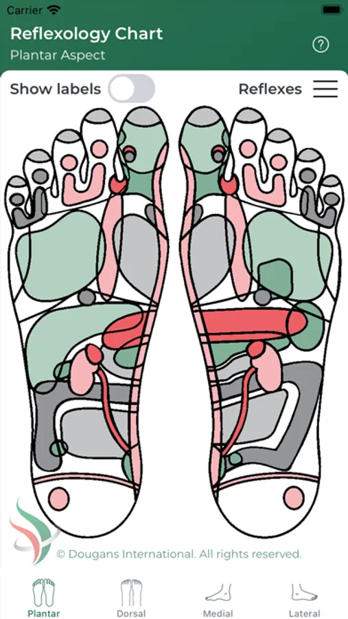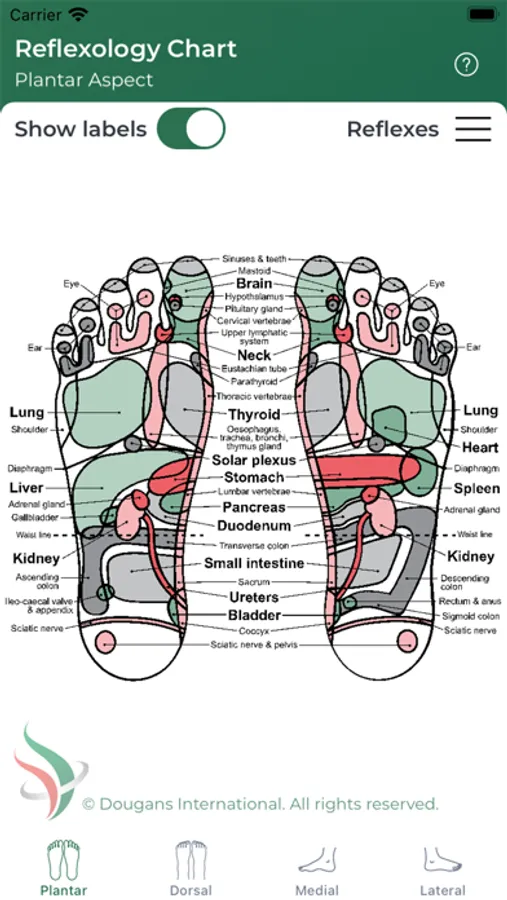 In reflexology, the feet represent a ‘microcosm’ or mini-map of the whole body. All primary organs and body parts are mapped in a similar arrangement of reflexes on the feet as they are located anatomically in the body. Our classic reflexology chart displays the reflexes on all aspects of the feet in user-friendly colours. Click each reflex to reveal the represented organ or body part.
