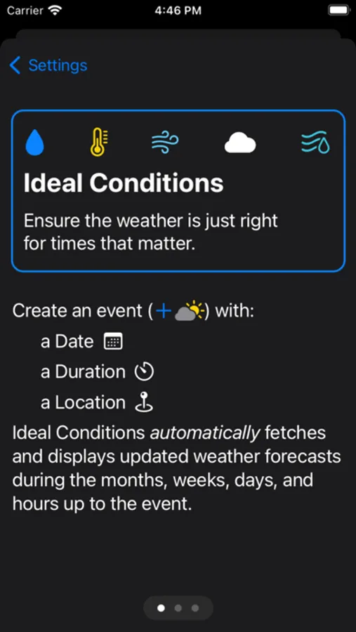 Create an event with a name, date, duration, and forecast location. Ideal Conditions then fetches and displays updated weather forecasts for the months, weeks, days, and hours up to the event. For a distant event date, historical weather displays until the event's date is within forecast range, and then forecast updates begin. Optionally, set a weather filter to see where desired weather conditions have been exceeded.