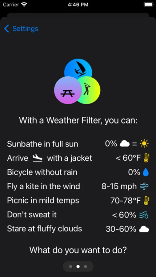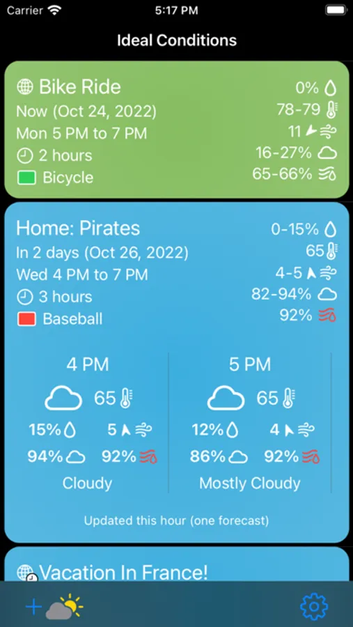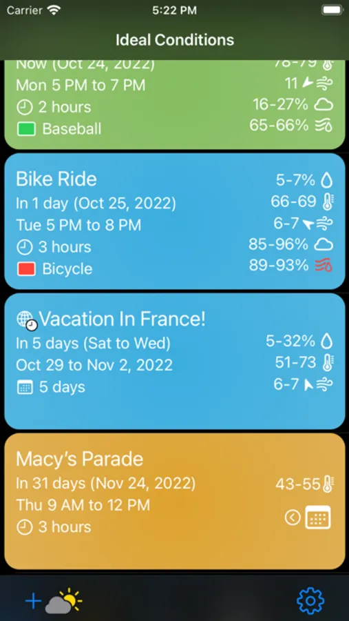 For events you must attend, you'll know the weather conditions in the weeks and days before. For events that depend on the weather, Ideal Conditions indicates if conditions are "just right" or may be questionable. Bicycle without rain and without strong winds. Go to the beach on a sunny day. Fly a kite when it's breezy. Land in another city with a jacket for cool weather. Picnic in mild temps. Do what you like to do.