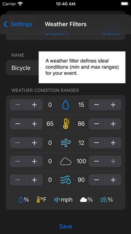 - Create weather filters with ranges for rain probability, temperature, wind speed, cloud cover, and humidity to define ideal conditions for each event.