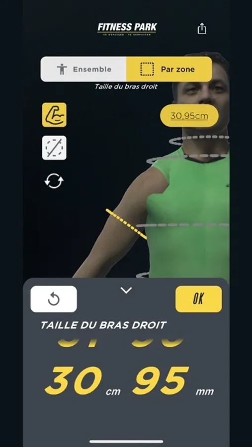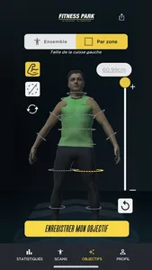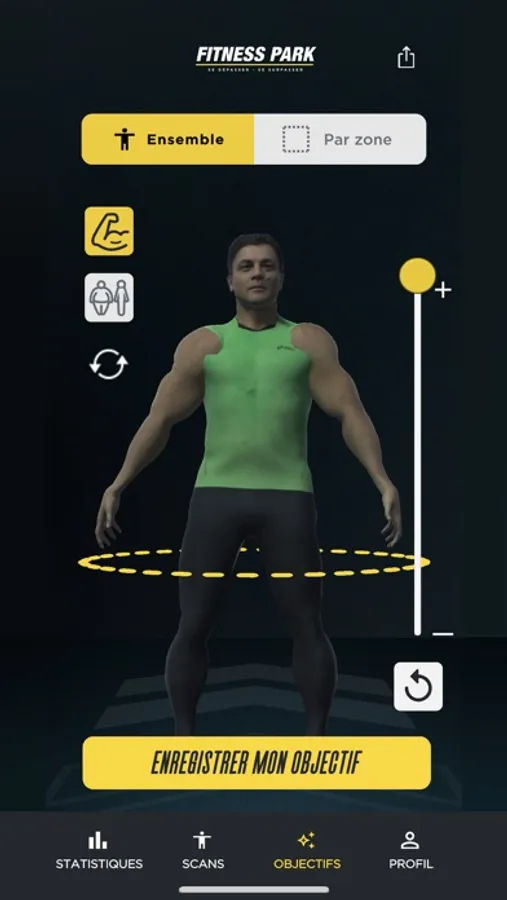 Modifie ton double 3D en fonction de tes objectifs : perte & prise de poids, prise de muscle. Déplace les curseurs pour voir les modifications en direct sur ton écran. Détermine directement les mensurations souhaitées par zone. Enregistre ton objectif pour valider ton avatar.