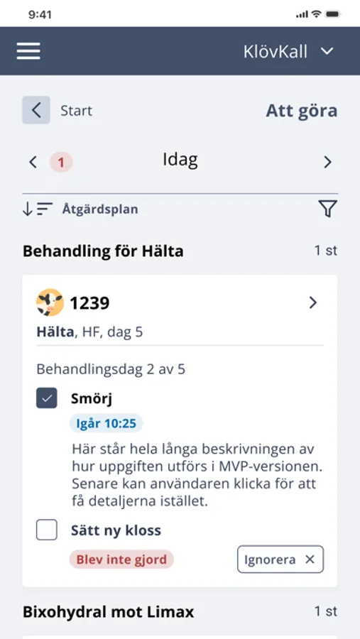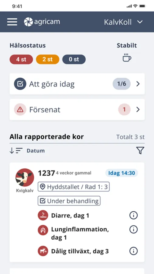 The basis is a simple and intuitive reporting of observations, developed specifically for the farmers situation. Standard procedures for various symptoms and conditions can be documented and are always available if needed. Treatment can easily be started and maintained. All reported issues and ongoing treatments are presented and available for all users at the farm. With easy-to-use and clear statistics on disease, conditions are created for sustainable and long-term animal health work.