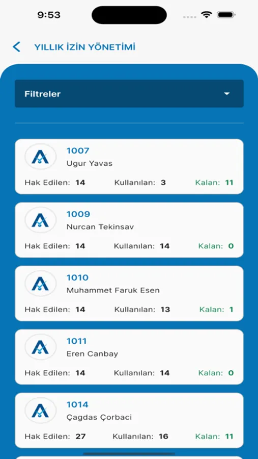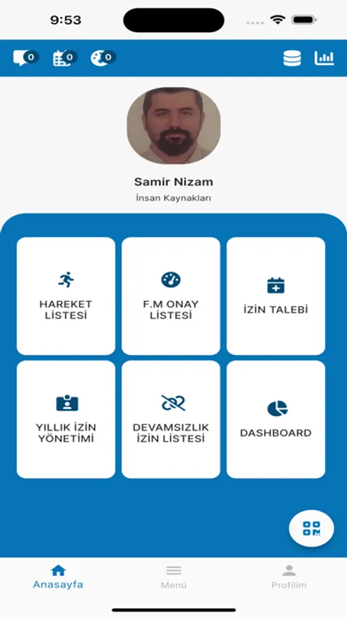 Hareket Listesi, F.M. Onay Listesi, İzin Süreç Listesi, Onay Bekleyen İzin Listesi, Yıllık İzin Yöntemi, Onaylı İzin Listesi, Personel Listesi, Devamsızlık İzin Listesi ve Günlük/Yıllık Dashboardlar