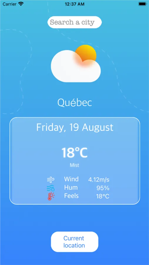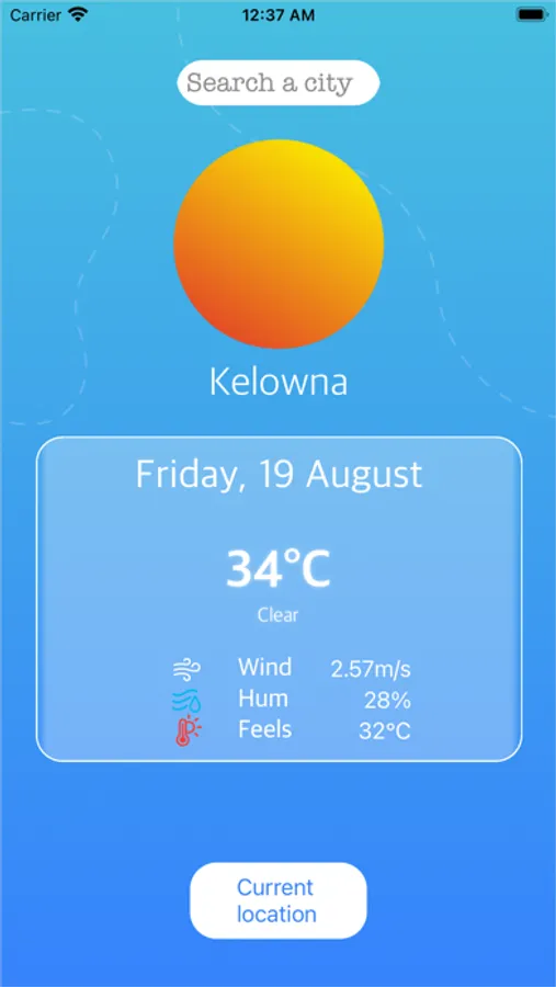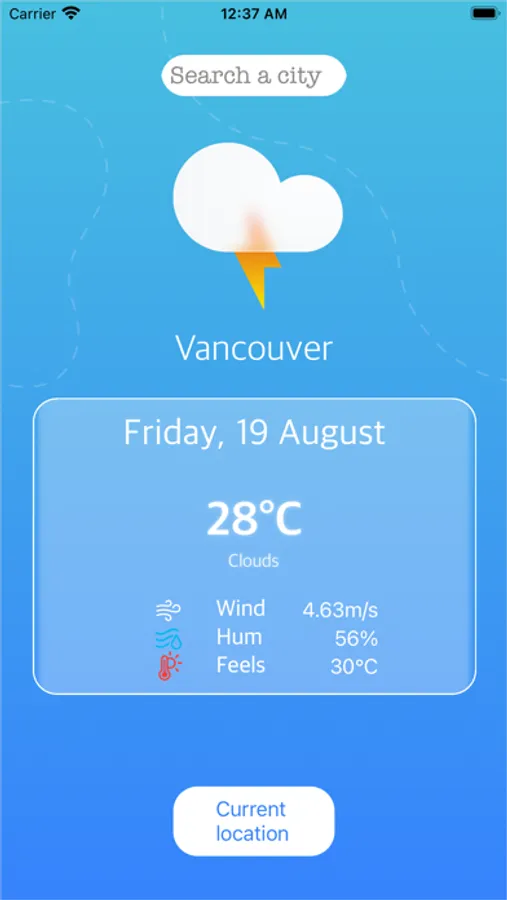 This application provides accurate weather information based on location and searches. This app will also provide wind speed, humidity information, feels like the temperature of the day for a location. The forecasts are fetched from OpenWeather API. If no city is found or an error happened, an alert will show up on the screen.