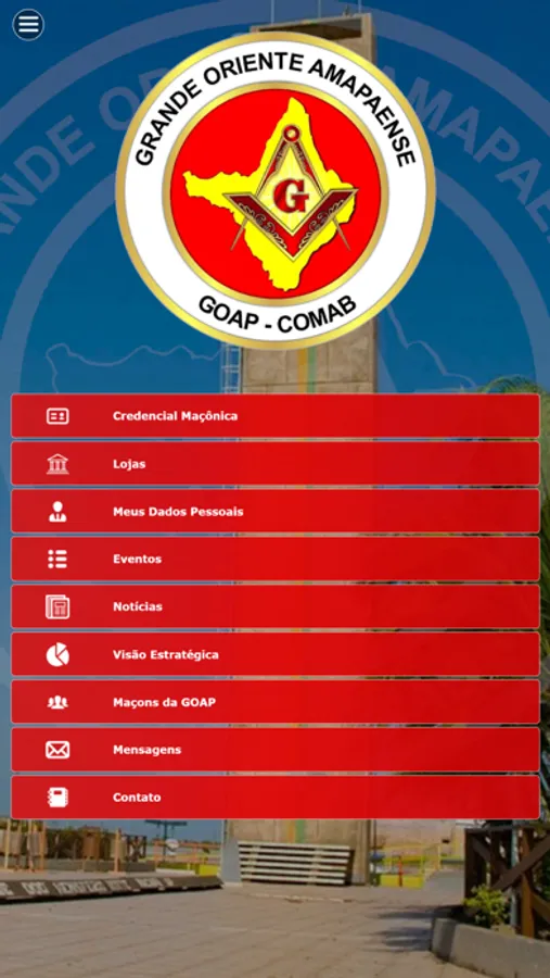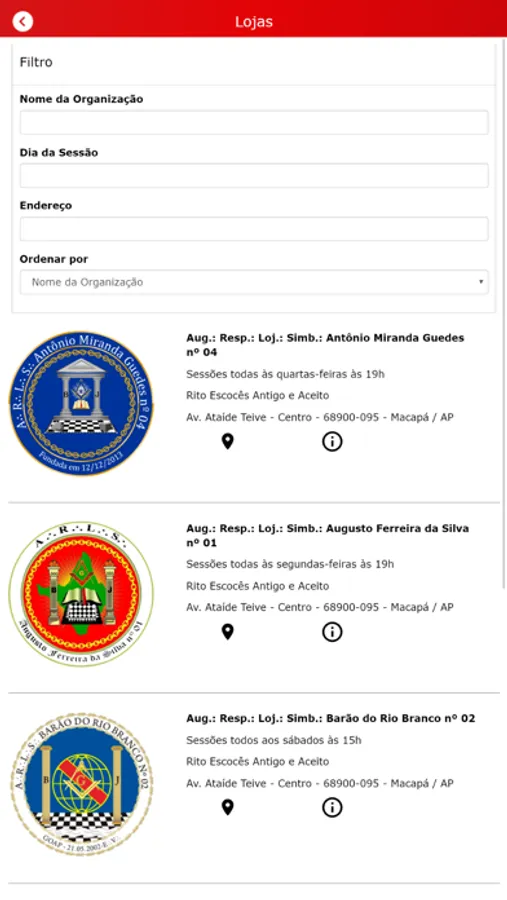 - Através do botão "Lojas" o usuário terá acesso as Organizações maçônicas que fazem parte da GOAP.