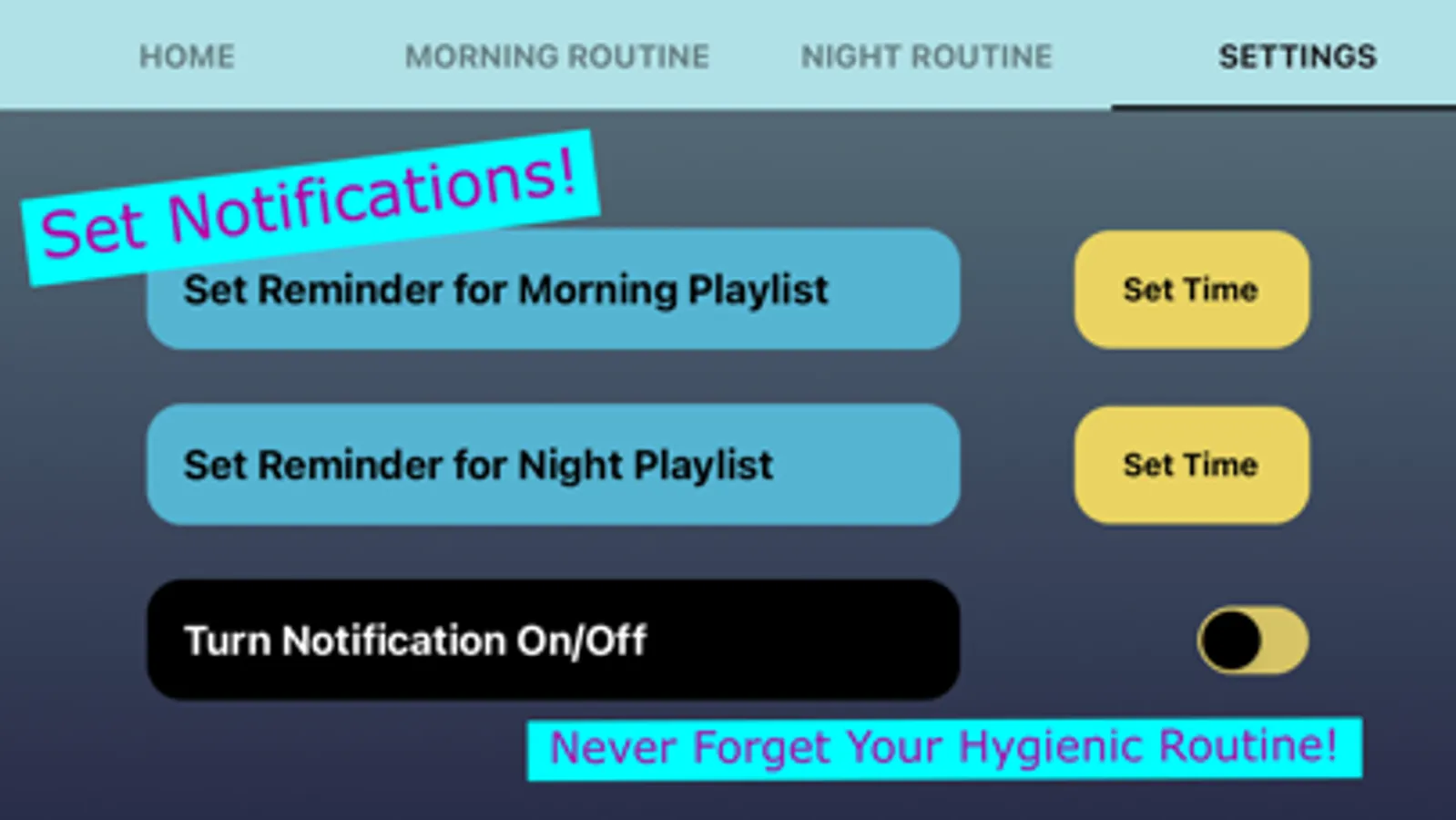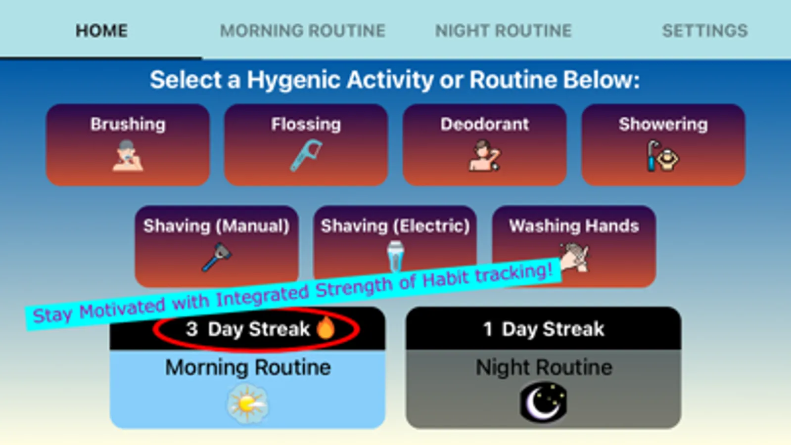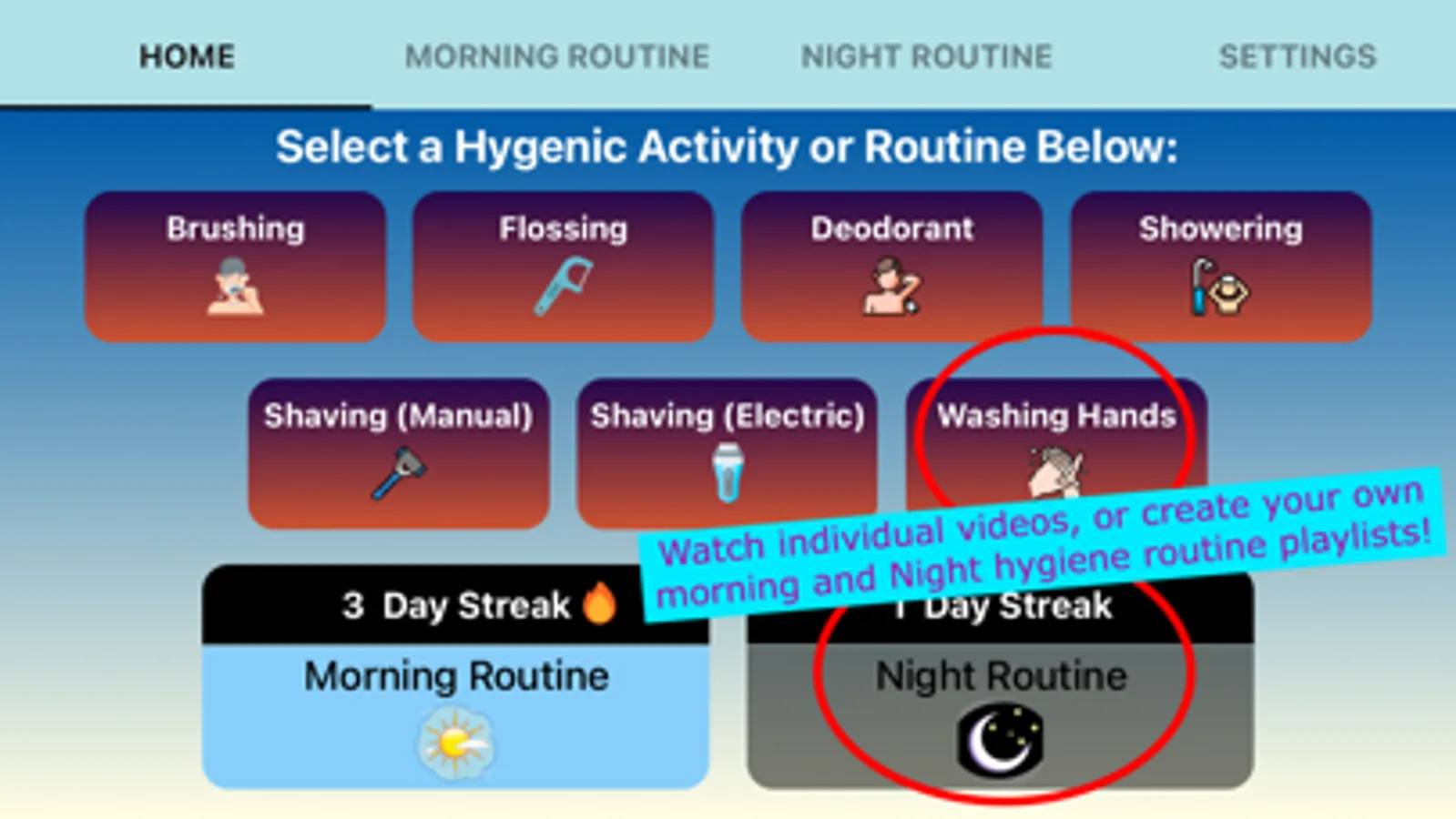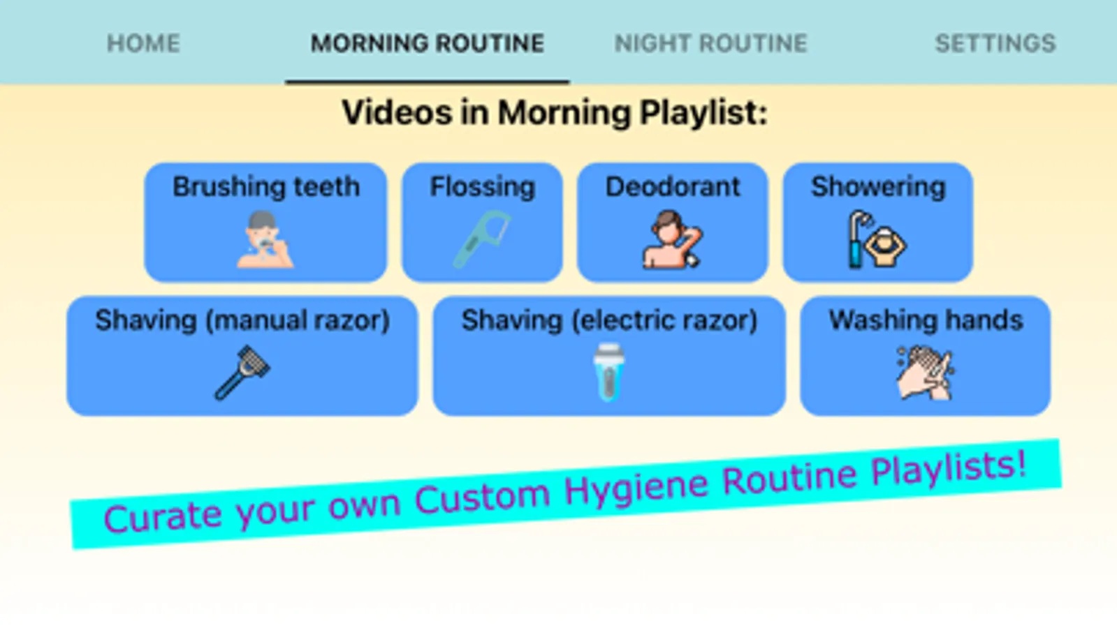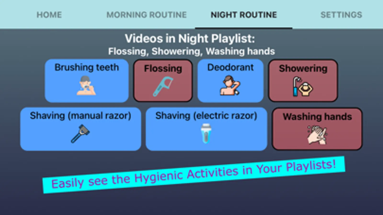 For Users that may have difficulty remembering all the different hygienic activities they need to do, such as remembering to floss, or specific parts of hygienic activities, such as remembering to brush your gums, Hygiene Helper gently reminds users of all facets of a task. Hygiene Helper not only displays all of ones needed Hygienic activities but allows users to make Day and Night playlists so every day, they can simply click on a playlist which ensures they are reminded to do every task.