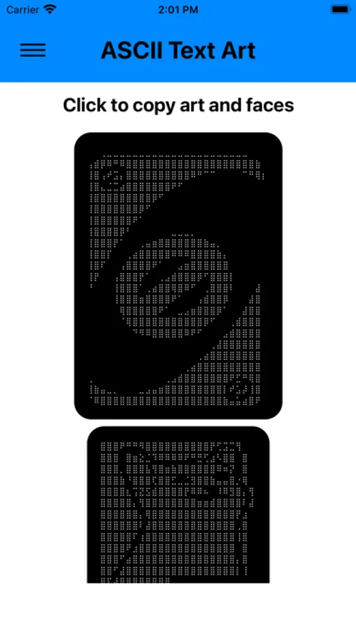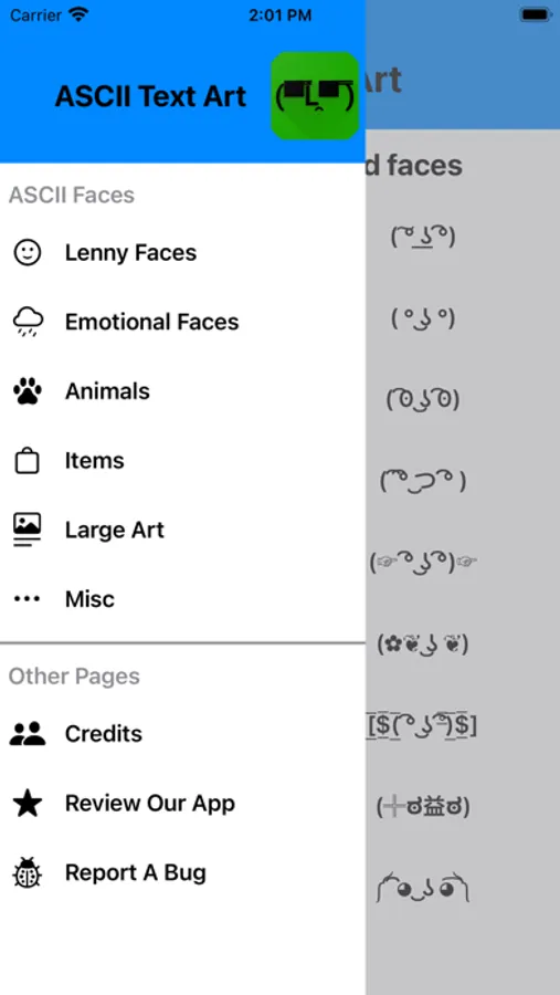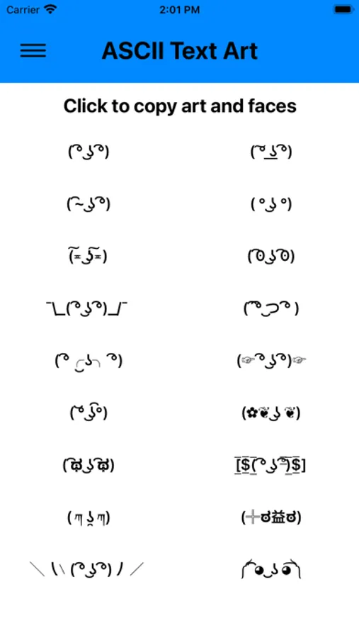 A simple way to use ASCII face art! Just tap to copy, and paste it in a message or any piece of text! More than 100 different ASCII art faces to use!
