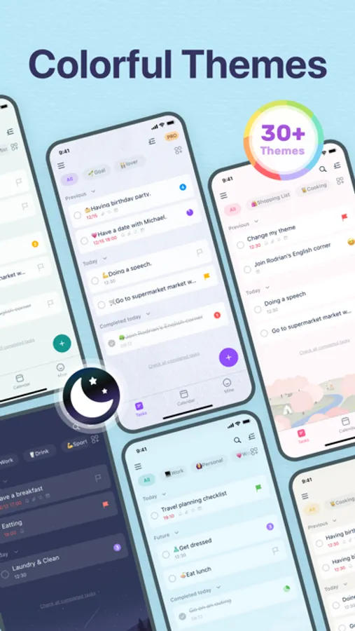 “To-do List - Tasks Reminders” provides a variety of theme colors. It makes you feel more comfortable when managing to do lists and completing tasks. This to-do list & task manager can manage all your task reminders for free. To Do List Task Manager supports managing your to.do.list and daily schedule planners in the Dark Mode (Some themes are for Premium)