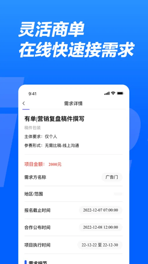 我们希望通过信息的综合服务,帮助企业和个人实现专业服务需求的撮合,使企业的服务更加高效。所以我们运营APP和PC的需求资讯平台,连接企业雇主和服务提供商,匹配企业需求与服务商专业技能,促成双方达成合作。