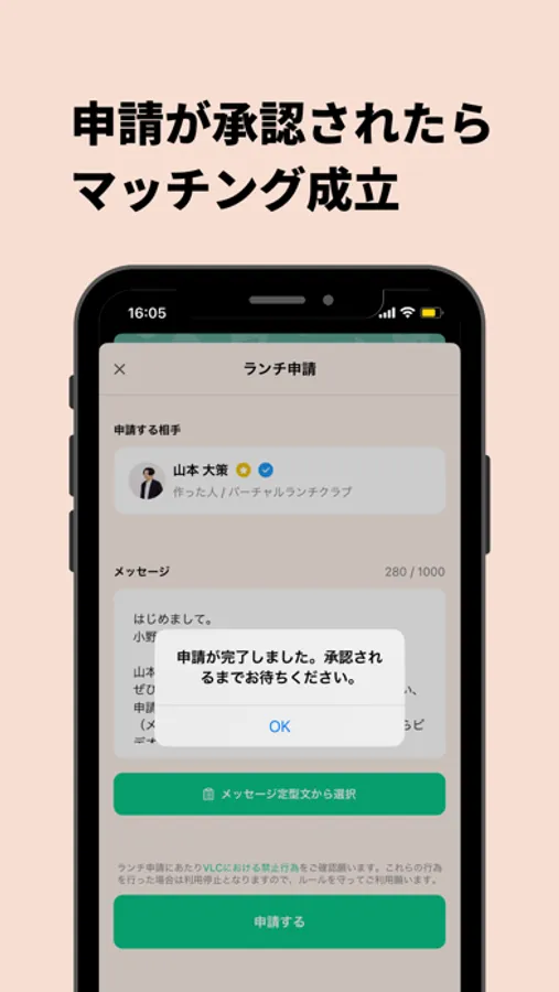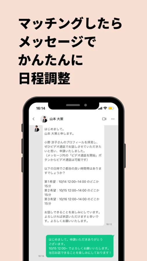 2. 話したい人に申請し、相手が承認次第メッセージで日程調整し、ビデオ通話する日時を決定