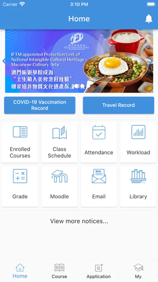 1. Home page: Students can receive push notifications of IFTM’s latest news, view institute announcements, check vaccination status and access other general functions, etc.