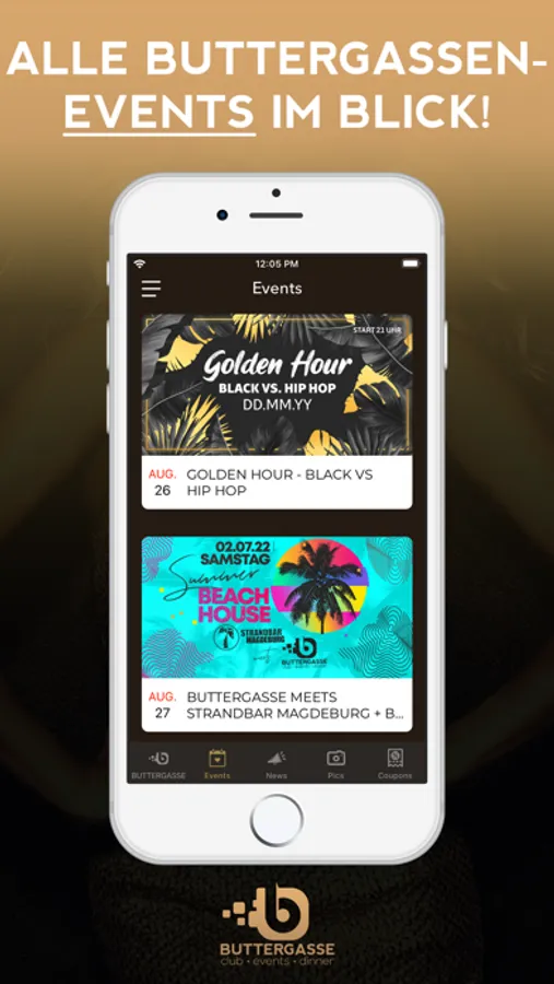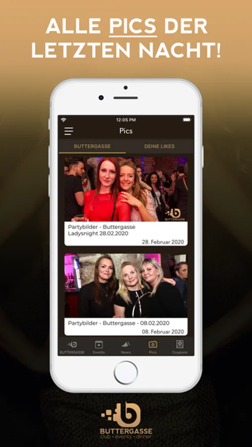 Du erfährst als erster, wann die nächste Party steigt und profitierst dabei noch von fetten Aktionen. Zum Event sparst du mit unseren Gutscheinen bares Geld. Damit du dich am Tag danach auch an den geilen Abend erinnern kannst, stellen wir alle Party-Pics in der App bereit.