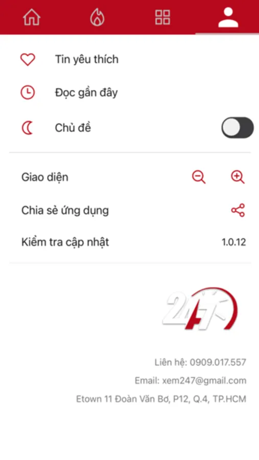 Xem247 là ứng dụng đọc báo thông minh với lượng tin mới khổng lồ được cập nhật liên tục 24/7. Được tổng hợp từ 80 đầu báo hàng đầu Việt Nam như Dân Trí, Thanh Niên, Tuổi Trẻ, Tiền Phong, Vietnamnet, VTV, Thể Thao 247, Cafef, VOV,.. Xem247 sẽ giúp các bạn cập nhật báo hay, báo mới, tin tức nhanh nhất, chính xác nhất từ các kênh thông tin chính thống.
