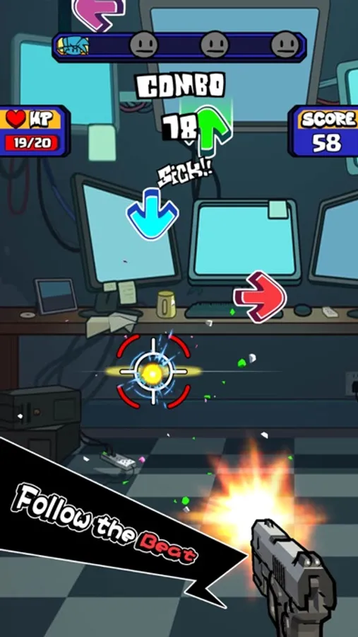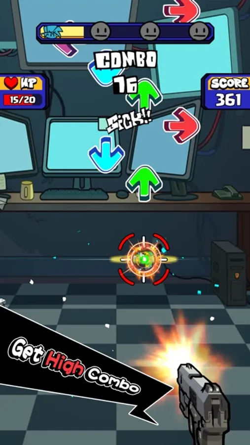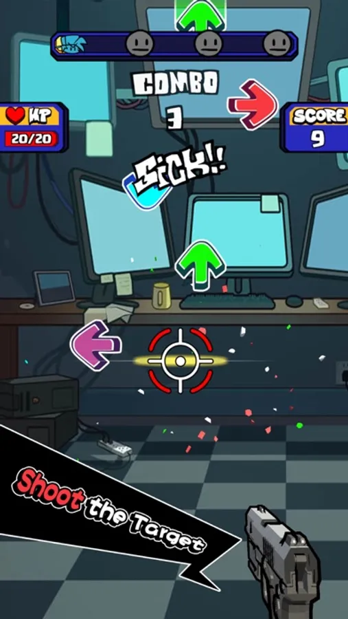 Move the gun sight to hit the music arrows. You will feel the gun shooting sound mix together with music.