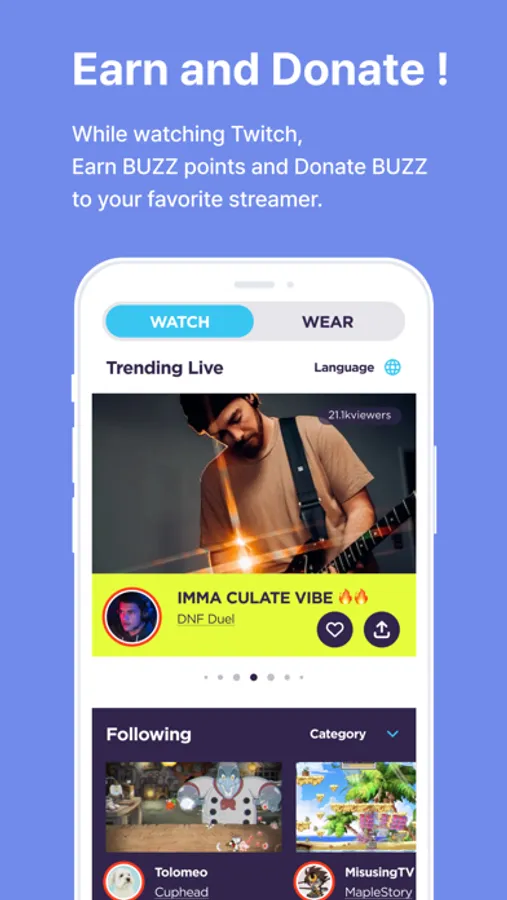 - Earn BUZZ points while watching content on Twitch, and Donate to your favorite streamer with BUZZ.