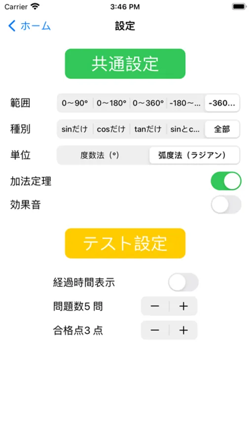 加法定理をオンにすると、三角比のテストモードと同様に15度系(12分のπラジアン系)も出題されるようになるので、これらの角の三角比も覚えたい場合はオンにしてみてください。