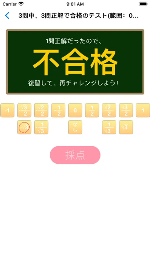 三角比のテストと同じように間違った場合でも、どれが正解だったか表示されるのでその場で復習することができます。