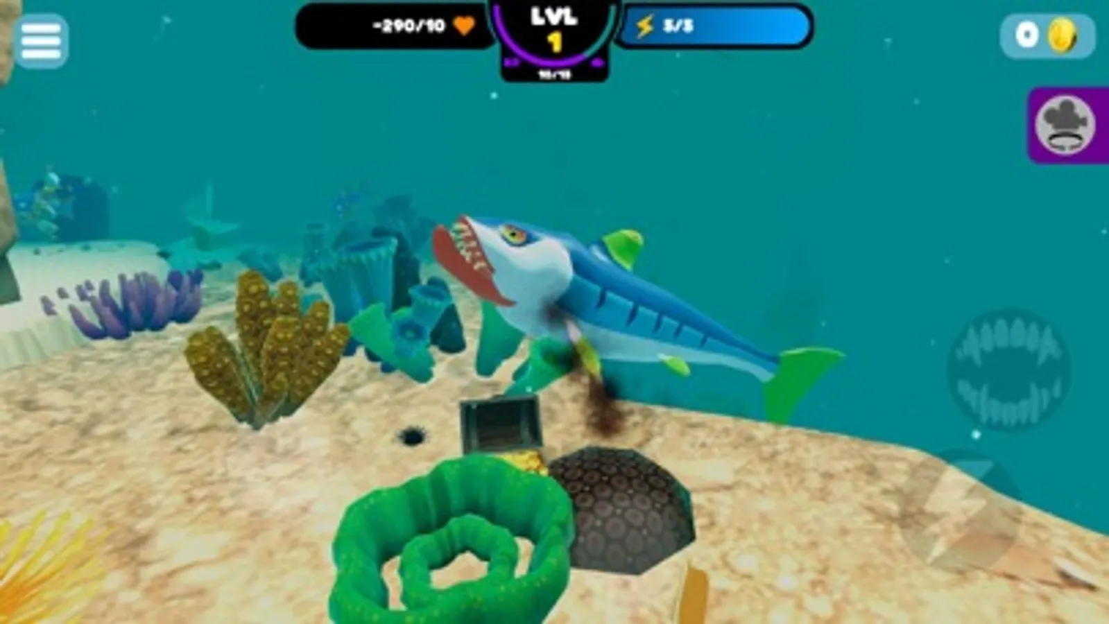 It is very simple Survive angry shark game. Hunt and eat. Make it big shark, fish.