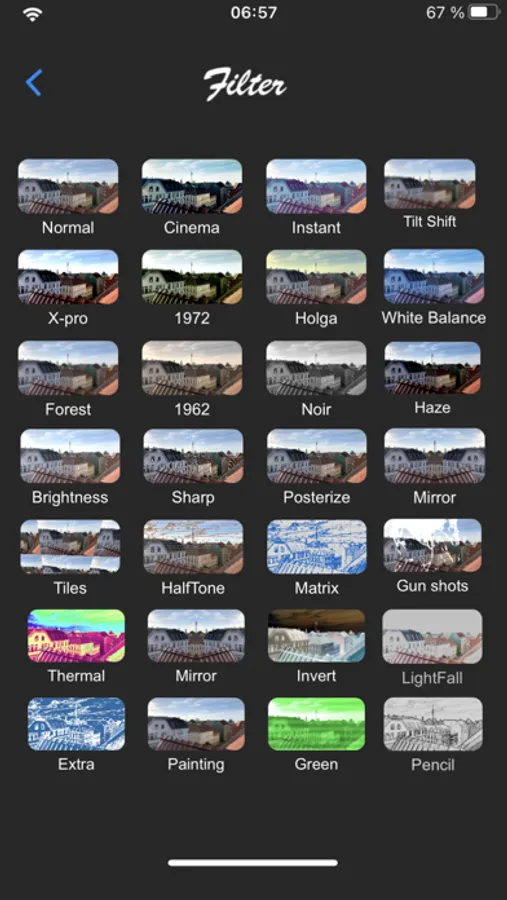 Cinema, Instant, X-Pro, 1972, Holga, 1962, Noir, Tilt Shift, Forest, White Balance, Haze, Brightness, Sharp, Posterize, Pencil, Gun Shots, Nightfall, Thermal, Mirror, Invert, Extra, Green Painting