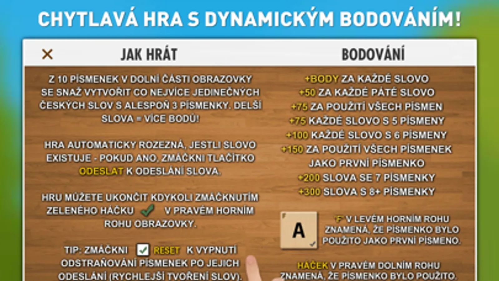 Snaž se vytvořit co nejvíce jedinečných českých slov z 10 písmenek na obrazovce a sbírej různé slovní bonusy. Prosím navštivte sekci JAK HRÁT pro více informací.