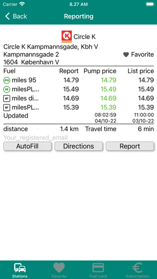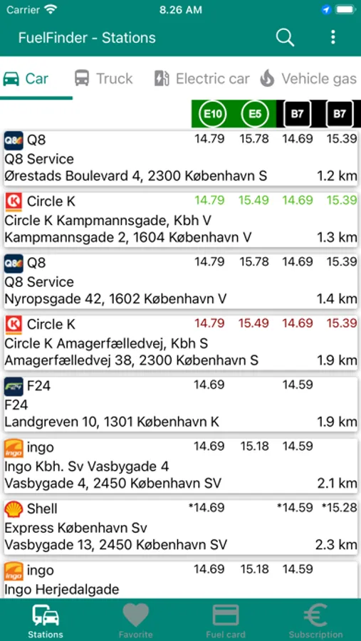 Based on location, the nearest stations for passenger car, truck, electric car and car wash are located in Denmark, Sweden or Norway. The list is shown with the prices available and the distance to the gas station for passenger cars. It is possible to enter new prices for gas stations. If a station is selected for a passenger car, truck, electric car or car wash, a route guide will be displayed. The same functionality is obtained by using the search function.