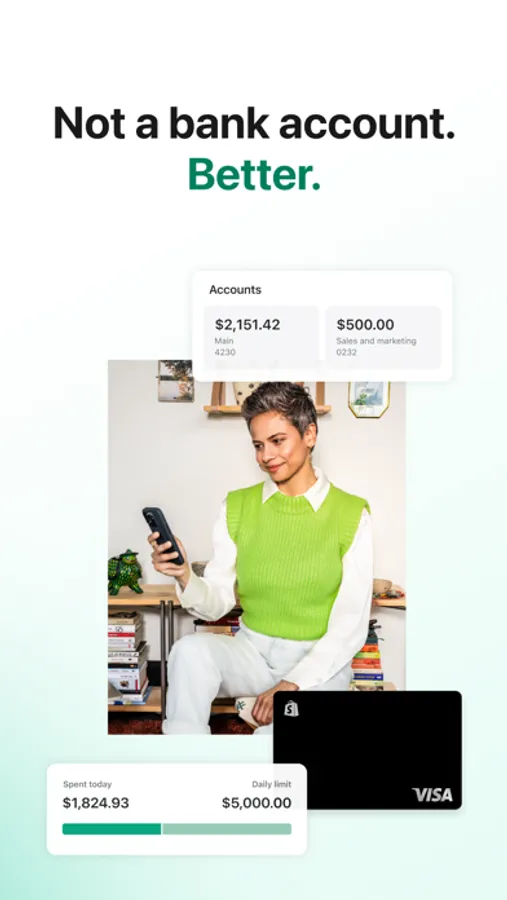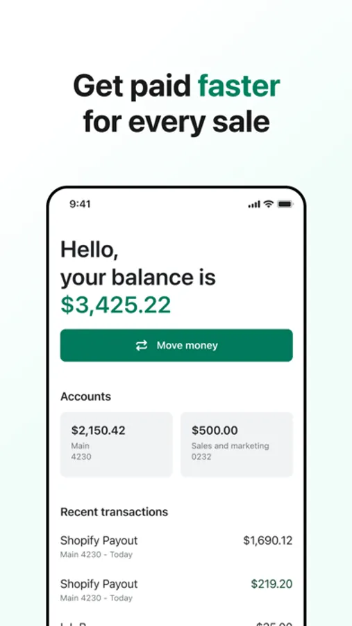 • Get paid out from your Shopify sales up to 7 days faster than with a traditional bank.