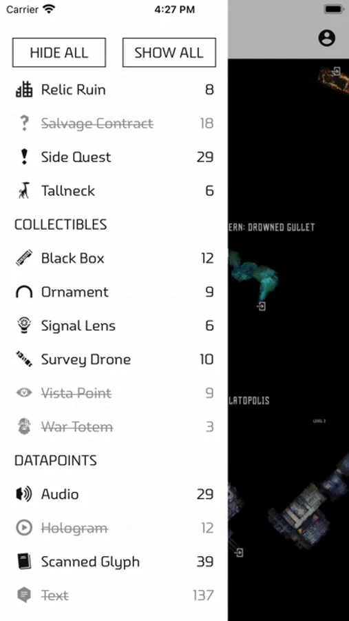• Progress Tracker - mark locations as found and track the progress of your collectables.