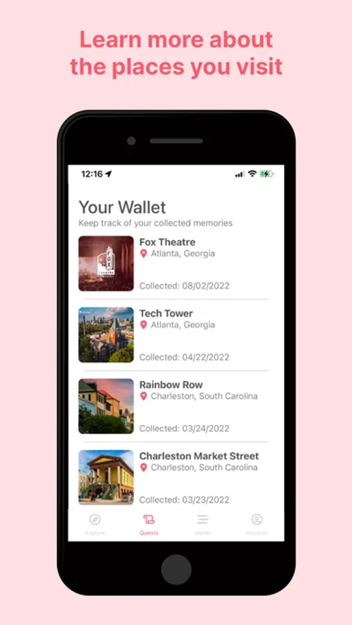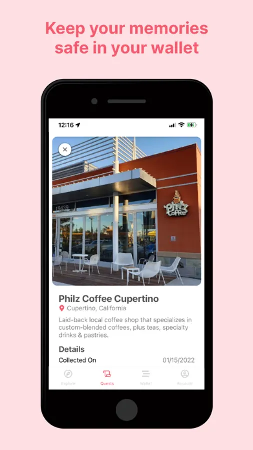 With Road Trip NFT, you can collect digital souvenirs of any road trip, at any event and even at your favorite restaurant or coffee shop. Using Explore, you can browse the map to discover souvenirs while out and about. If you get stuck, Quests will help you discover new adventures, plan road trips and find scavenger hunts to collect and explore. Everything you collect is securely stored in your wallet so you don't have to worry about losing mementos of your best memories.