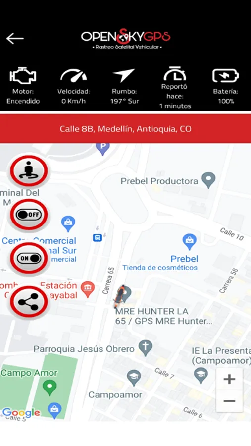 Open Sky GPS podrás además de rastrear tu vehículo, apagarlo remotamente, recibir alertas de apertura de switch o llave, apertura de puertas, golpes, exceso de velocidad, entrada/salida de geocercas entre muchas otras opciones.