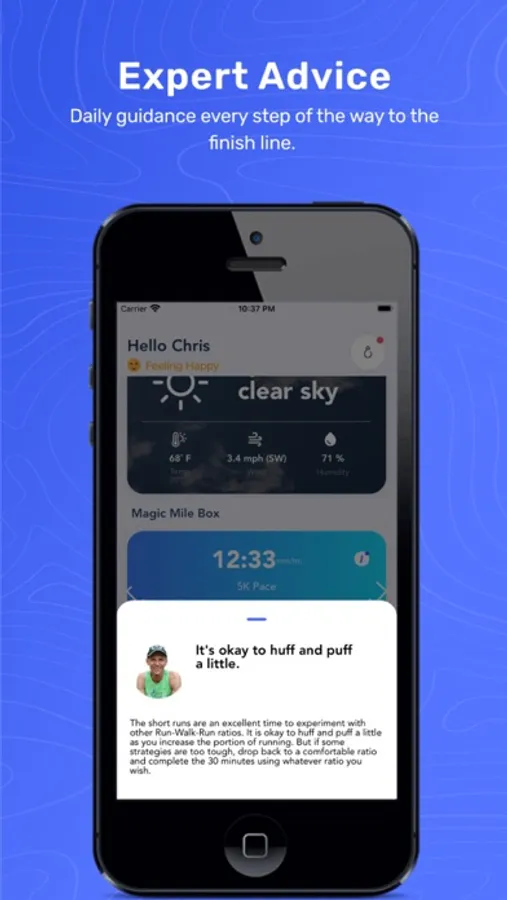 • Completely interactive. Change your workout at anytime and your coach Jeff Galloway — and your music — will respond!