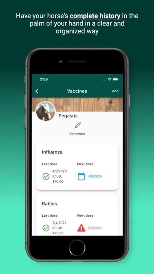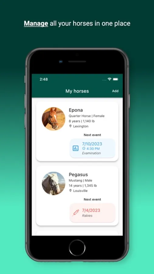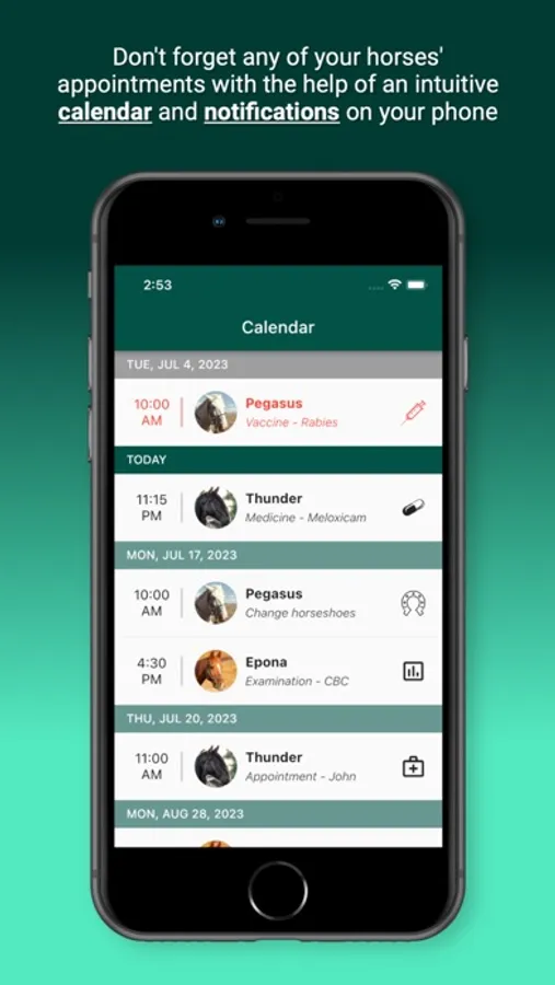 - Receive notifications on your phone about upcoming appointments for each of your horses