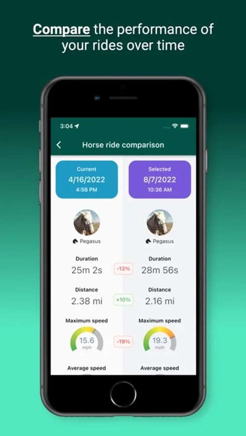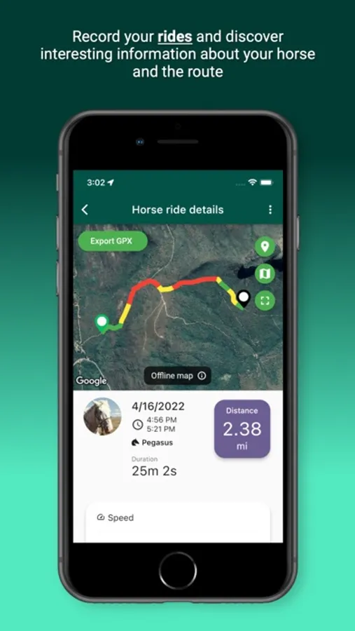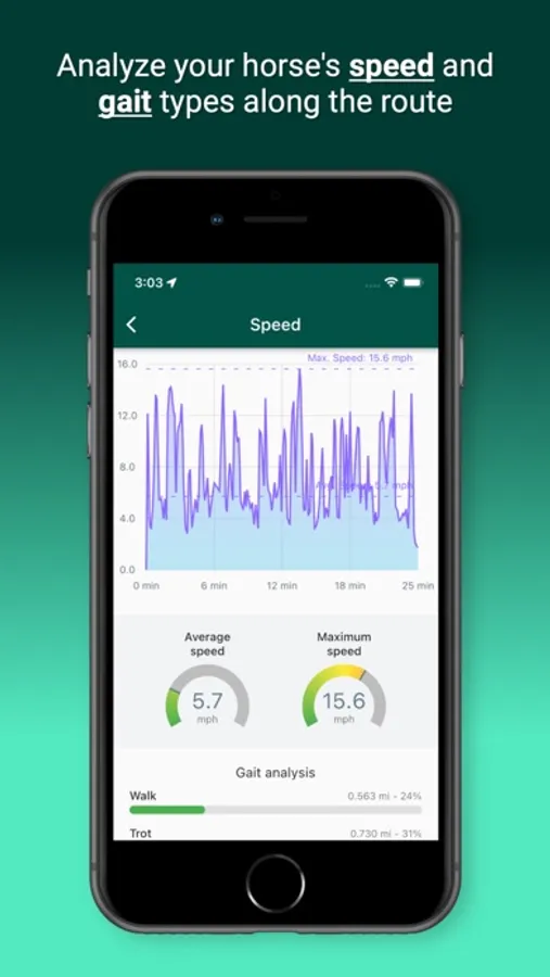 - Speed analysis: find out the maximum and average speed of your horse during the ride and see through graph and map the speed variations along the route