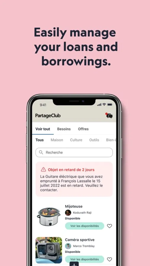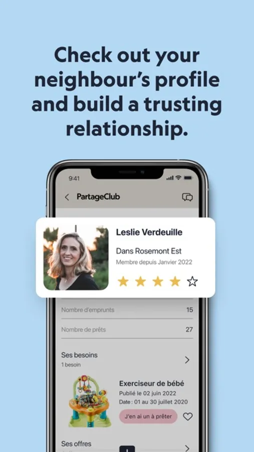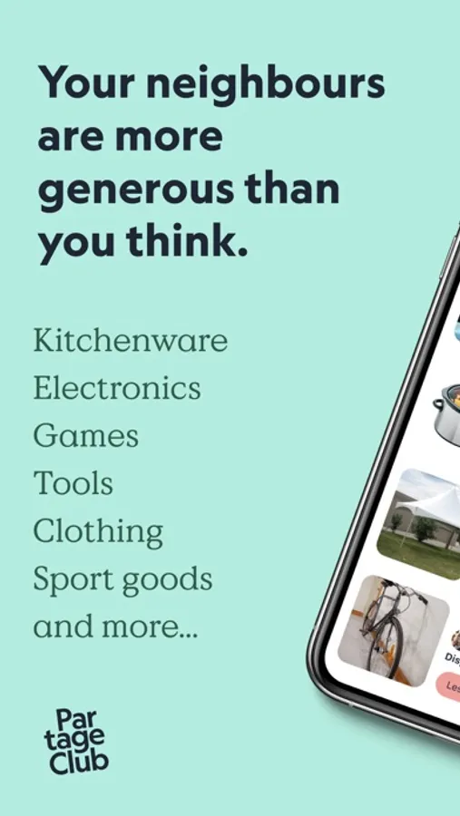This application will help you buy less. Partage Club is an application that facilitates the lending of objects between neighbours in a safe, positive and unlimited way. The application allows you to limit your consumption, without asking you for a monetary or functional sacrifice. You can lend your objects as well as borrow from your neighbours, via catalogues of goods or by publishing your needs.