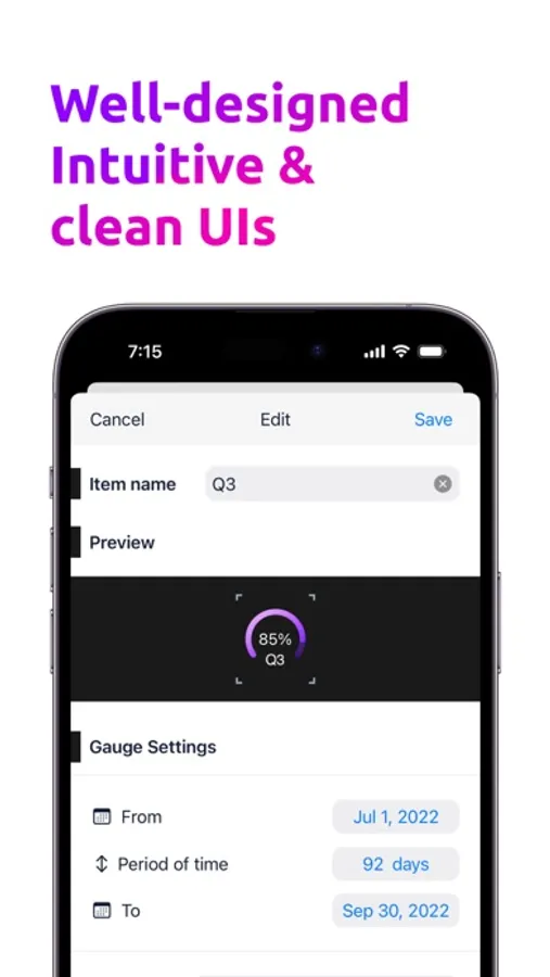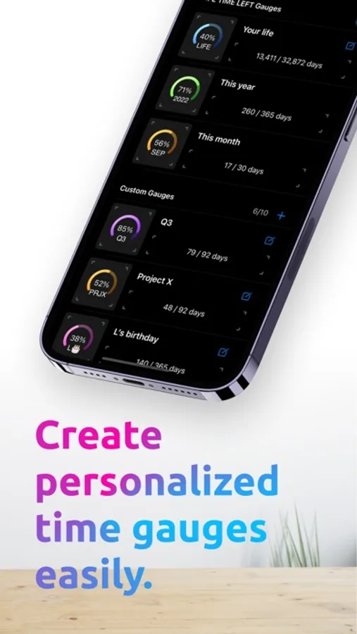 Personalize your gauges with custom labels and colors, and use them as lock screen widgets or Apple Watch complications. You'll be constantly reminded of the importance of time and motivated to make the most of every moment.