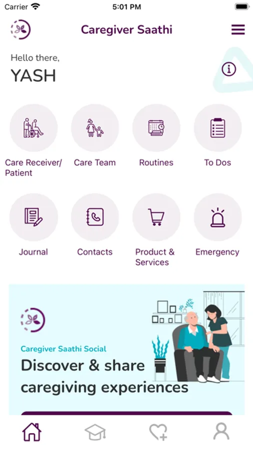 Caregiver Saathi app is a complete tool for family members who are caregivers and need to organize themselves, access resources and ensure their well-being. It is a one stop solution for all your caregiving needs.