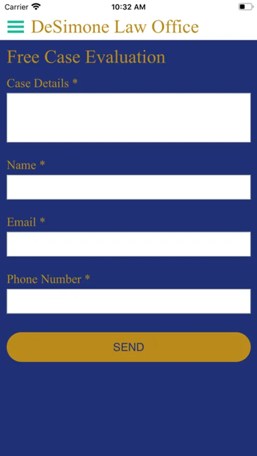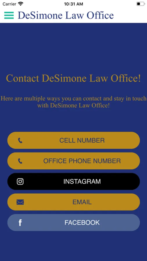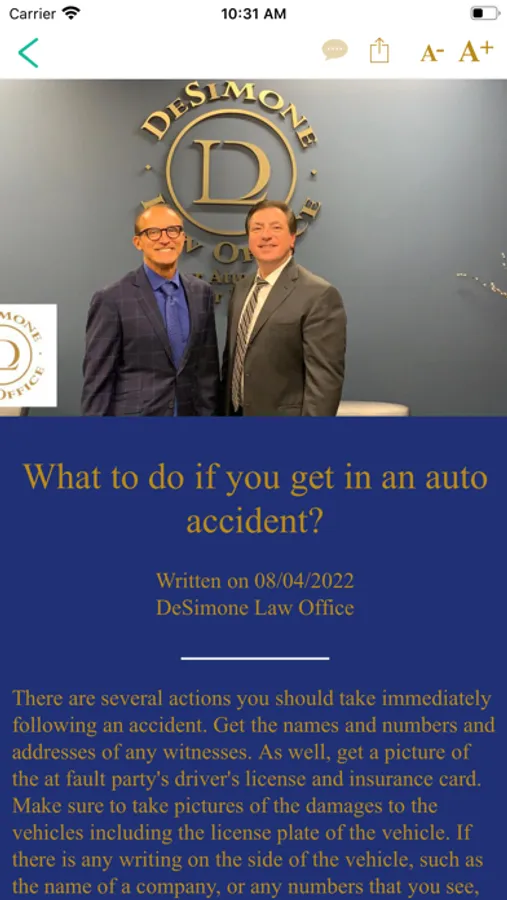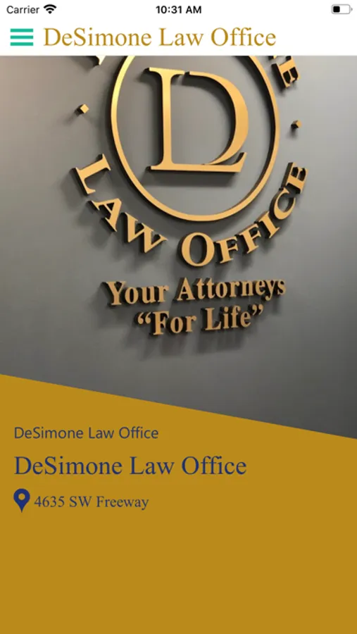 This app is to inform current and potential clients of DeSimone Law Office of their rights if they've been in an auto accident. The app also tells them what to do at the scene of an accident. The app also provides information on the attorneys at the firm including their education and years of experience. This app informs potential clients of services that they will receive, if they’ve been in an accident and hire DeSimone Law Office to represent them. DeSimone Law Office is located in Houston Texas. The app gives clients information on how to get to the law office, including a link to google maps that will take them directly to DeSimone Law Office from their location. The app also allows clients to automatically get in contact with an attorney at DeSimone Law Office by dialing a link to the law office phone number or a link to the cell phone for one of the attorneys. The app also allows the clients to directly get to the website of DeSimone Law Office where there is more information about the law firm and the services the law firm provides. The website also includes many years of posted blogs which provide detailed information about auto accidents and various aspects of how they are handled at DeSimone Law Office.