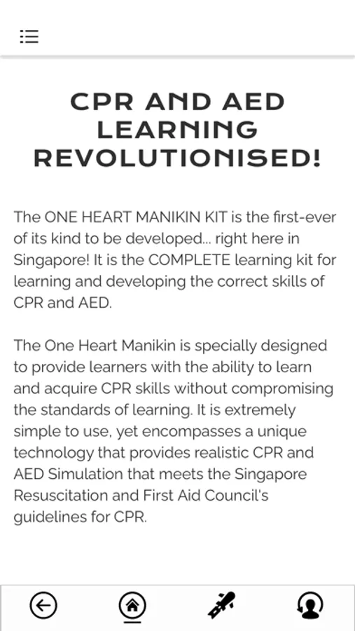 The One Heart Planet CPR AED app includes simple, step-by-step video demo and instructions aligned with the latest AHA and SRFAC guidelines for performing CPR and using the AED. Includes the One Heart SimulAED that turns your phone into a powerful AED simulator! Developed to be used along with the One Heart Manikin Kit, which includes a lightweight manikin and AED training accessories