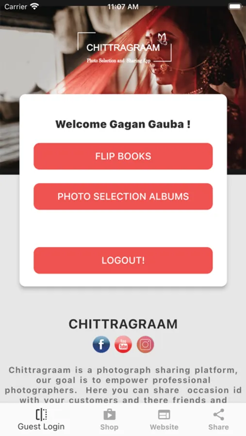 Chittragraam Client App Provides Photo Selection Services, and Flipbooks to their customers. Customers can log in and view their events in the form of 3d flipbooks and also they can do photo selection of their respective events on their smartphones at ease. Customers can also share albums with their near and dear ones.